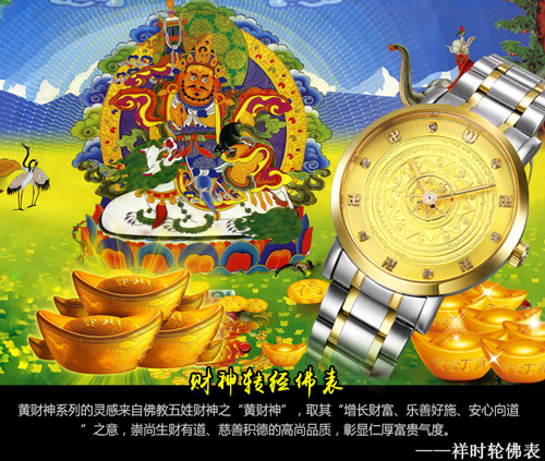 3.黃財神系列佛表;黃財神被譽為五大財神之首,關于很多美麗的傳說都是黃財神有關,所以設計師在設計黃財神佛表的時候精心研究中國財神文化,通透其寓意,了解其生財之道,故而花了很長一段時間才將其研究出一款,也是因為僅僅這一款黃財神壇城SL-L6913其他任何佛表都無可比擬的,濃縮了黃財神之全部精華讓人隨身攜帶,可幫助人財運亨通,財源不斷,過年送于親戚或者好朋友最好不過。